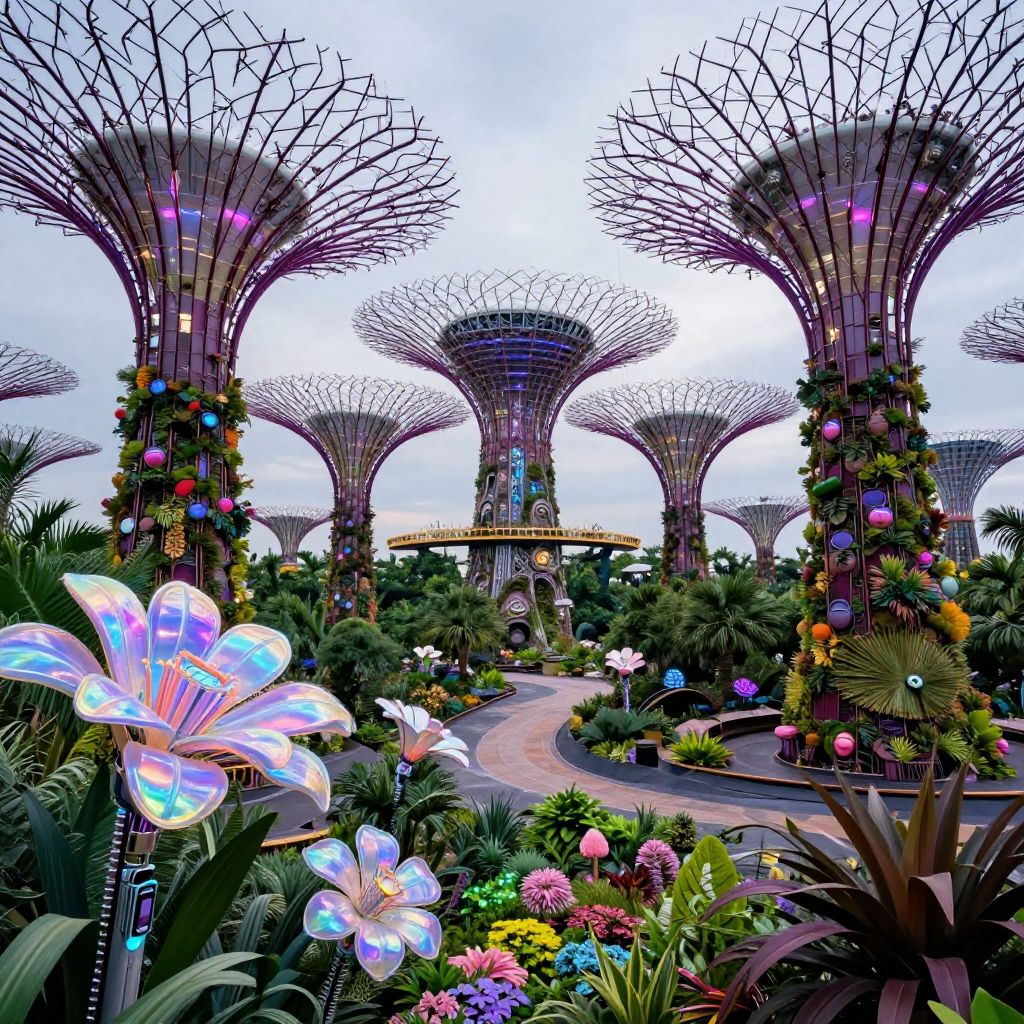 Photograph of an futuristic botanical garden featuring towering, tree-like structures with intricate, lattice-like branches adorned with colorful lights. The background showcases a central, dome-shaped structure. In the foreground, vibrant, iridescent flowers with purple and pink hues stand out among lush greenery and various colorful blooms. A winding path guides through the garden, with more plants and flowers on either side. The sky is overcast, providing soft, diffused light. The overall scene is whimsical and futuristic, blending natural and artificial elements.
