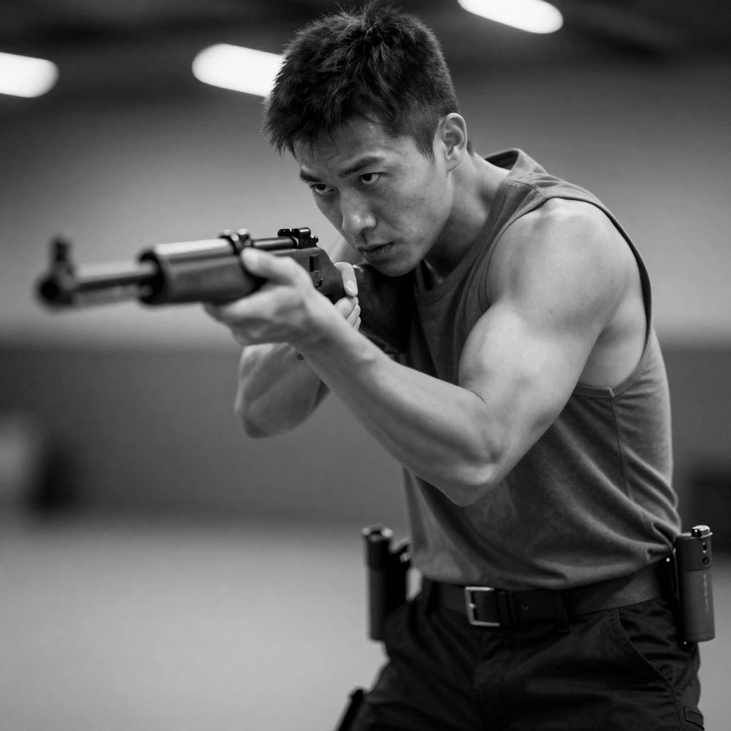 Photograph of a shirtless man with short, dark hair, holding a black handgun in his right hand, looking to the right. Background features a blurred figure in a green uniform and a dimly lit room with a grid-patterned wall. The man's expression is intense, and the lighting is dramatic.