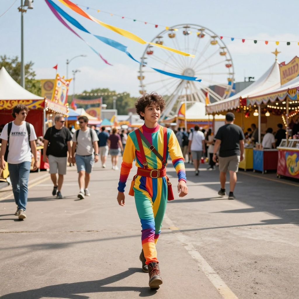 A young acrobat dressed in a tight-fitting, colorful outfit with stripes and straps, walking down a lively carnival street. The scene features bright afternoon sunlight, festive ribbons floating overhead, a large Ferris wheel, and carnival tents. Multiple people stroll around the carnival, enhancing the energetic atmosphere. The setting is outdoors in a bustling urban carnival square.