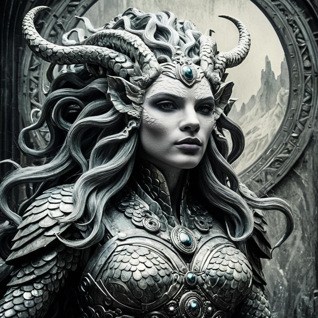 Santa Muerte, best quality, digital painting, extremely smooth, fluid, 3d fractals, light particles, dreamy, smooth, shimmering, dreamy glow, conceptual art by alberto seveso, anna dittmann, arthur rackham, harmonious color scheme, 32k, cinematic photo a marble statue of Medusa, mid shot, perspective from below, woman portrait fused with structure, short messy hair with coiling marble snakes, black and gold scaly outfit inspired by karol bak, intricate details, long sleeves dress, provocative, seductive, parted lips, evil smile, trending on artstation, black background, simple background, style of Karol Bak, 35mm photograph, film, bokeh, professional, 4k, highly detailed, Woman, Latina, Hispanic, Chicana, Digital artwork, Digital masterpiece, Digital creation, Ethereal lighting, Magical lighting, Transcendent atmosphere, Ethereal glow, Versatile for different scenes, Balanced depth of field, realistic photo