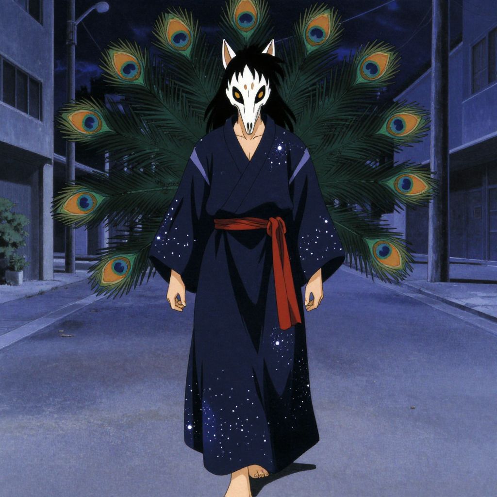 Digital art of a masked figure with a white fox face, black kimono, red sash, and peacock tail, walking down a blue-l