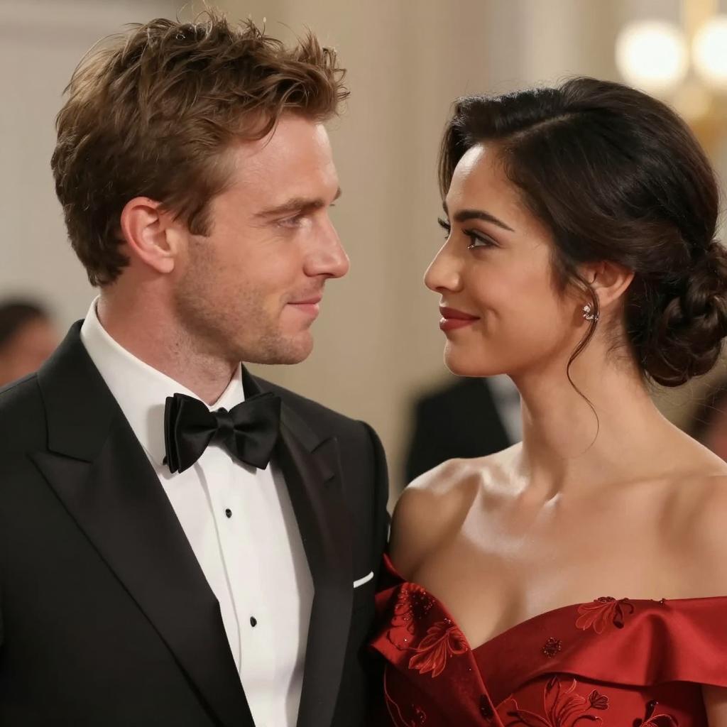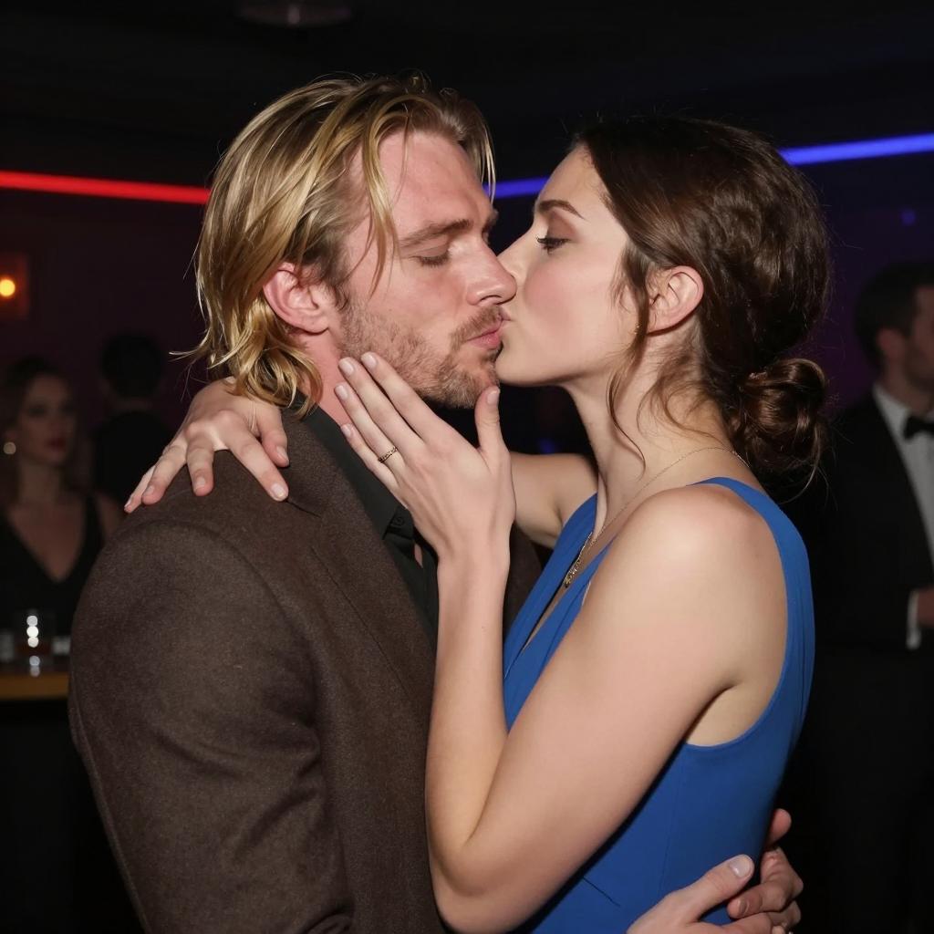 A man and woman in a dimly lit nightclub. The man has long blonde hair, wears a brown suit, and touches his chin thoughtfully. The woman, with brown hair in an updo, wears a blue dress, and kisses his cheek. Background includes blurred lights and people. The man's face shows concentration, the woman's face is partially obscured by the kiss. Both have intense expressions. The woman's right hand is on the man's shoulder.
