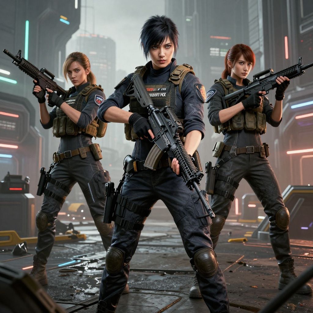 Female Rainbow Six Siege characters in iconic tactical gear, futuristic urban battlefield backdrop, dynamic pose, detailed weapons, intense lighting, hyper-realistic style