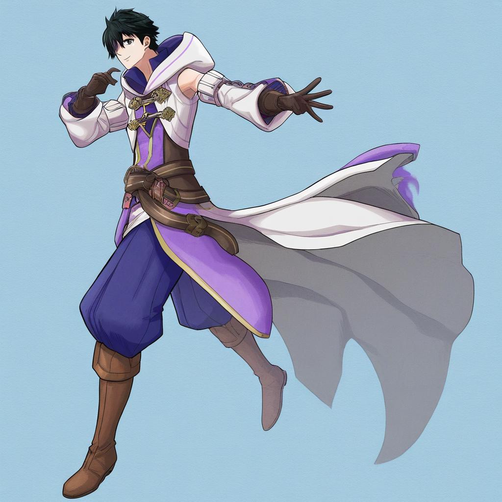 Digital illustration of Morgan, a male character from the Fire Emblem series, depicted with black hair, purple eyes, and wearing a detailed outfit including a long white and purple coat, puffy blue pants tucked into knee-high brown boots, gloves, and a belt. The character is shown in a dynamic pose with detached sleeves and a hood down, against a plain blue background.