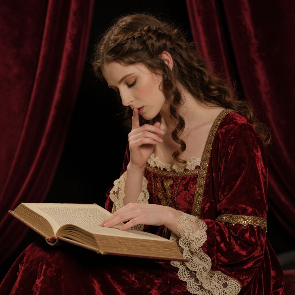 Photograph of a fair-skinned, young woman with long, wavy brown hair, styled in loose braids, reading an open book. She wears a rich, dark red velvet gown with gold lace trim on the sleeves and neckline. Her right hand is raised to her chin in a thoughtful pose, while her left hand rests on the book. The background features deep red velvet curtains, adding a luxurious feel. The image emphasizes elegance and contemplation, with soft lighting highlighting her delicate features and the texture of her dress.