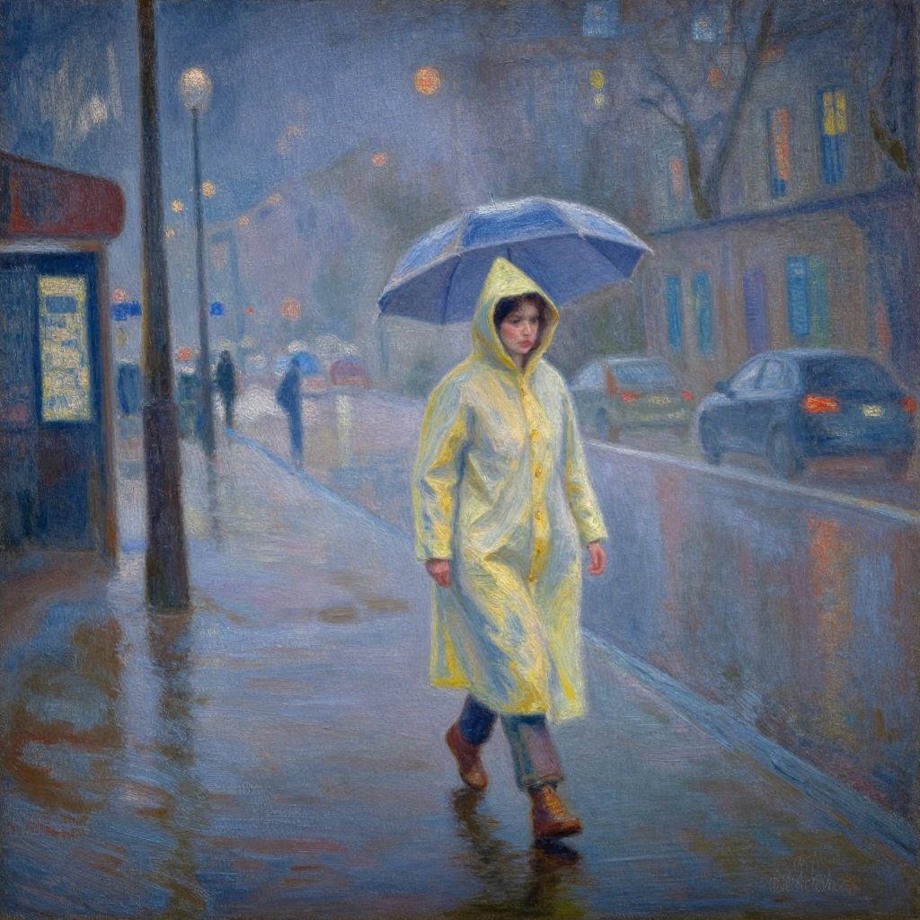 Ellipse A night scene with a woman walking through the city in the rain. She is wearing a yellow raincoat. It is foggy and cold. Painted by Claude Monet.,