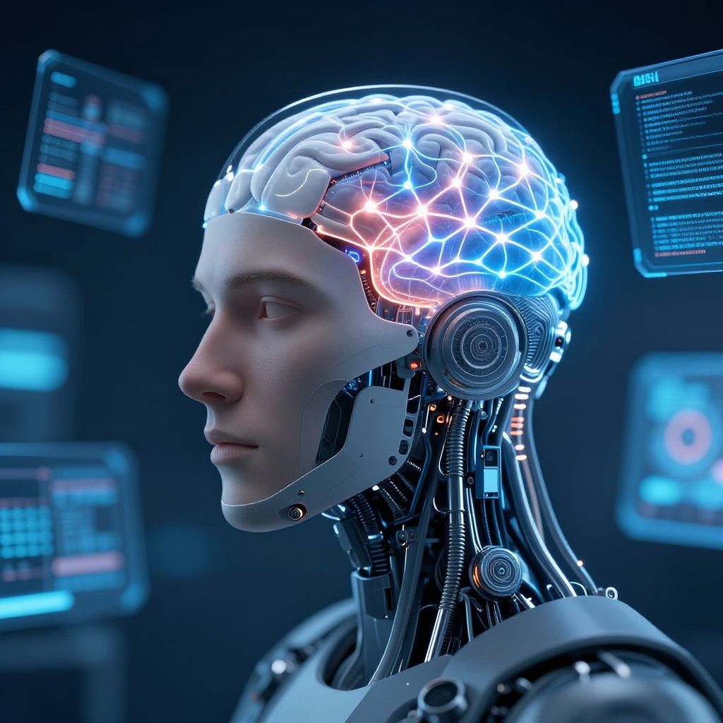 CGI image of a futuristic, robotic human head with glowing blue and red neural patterns, surrounded by holographic screens in a dark, high-tech lab