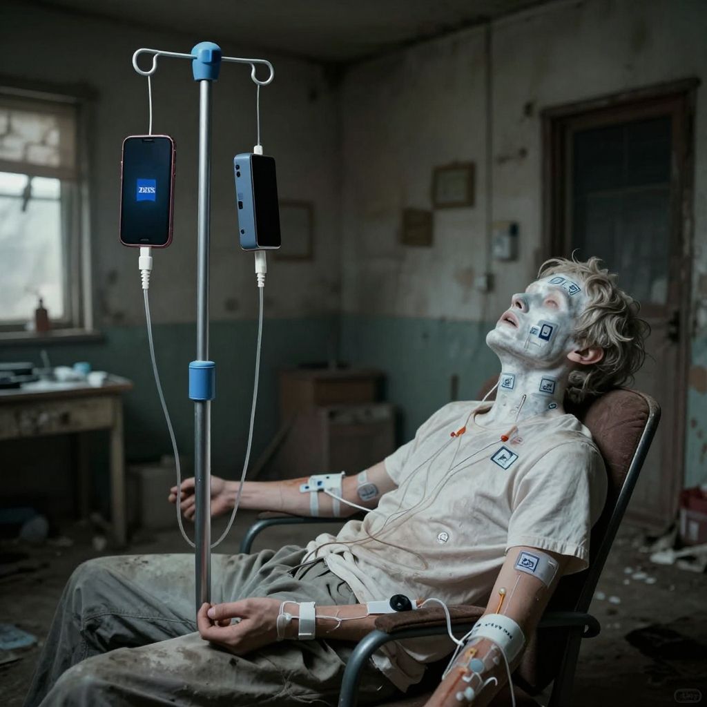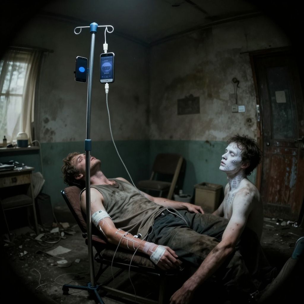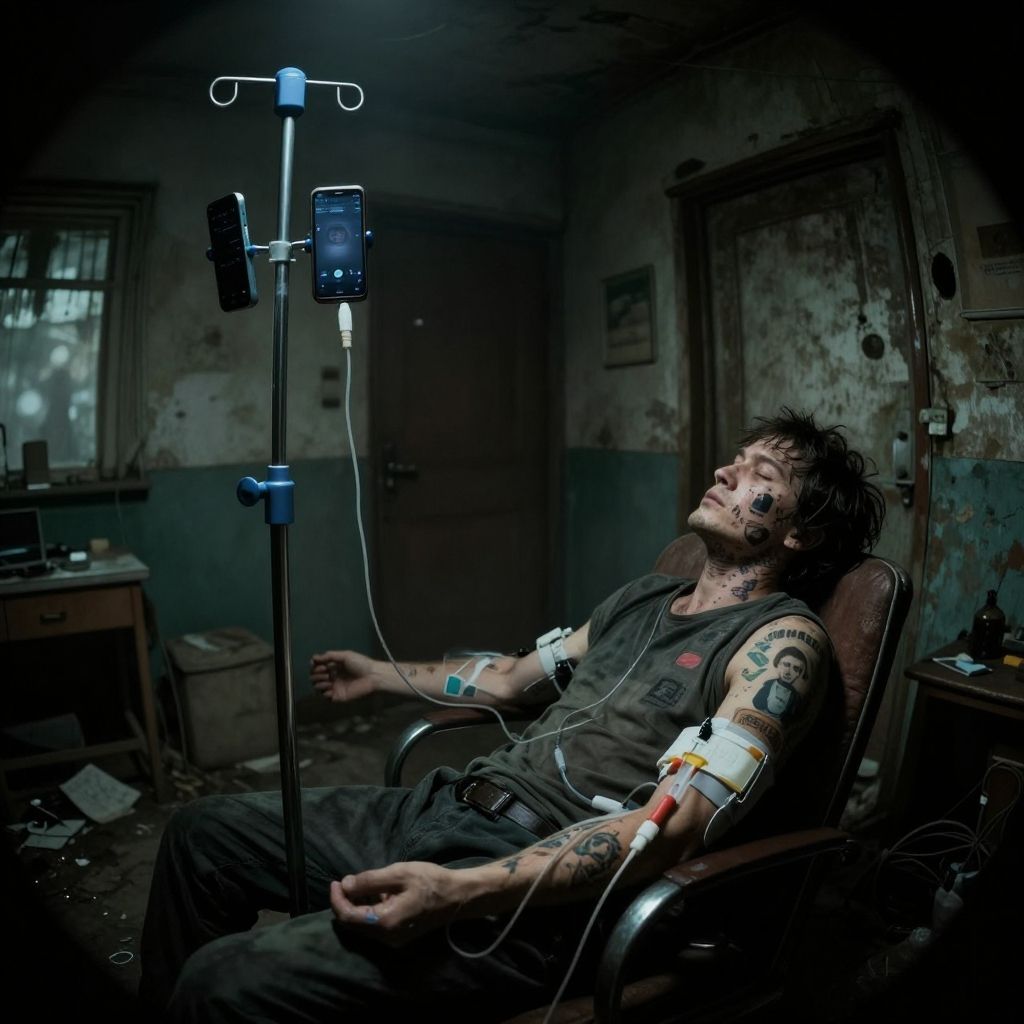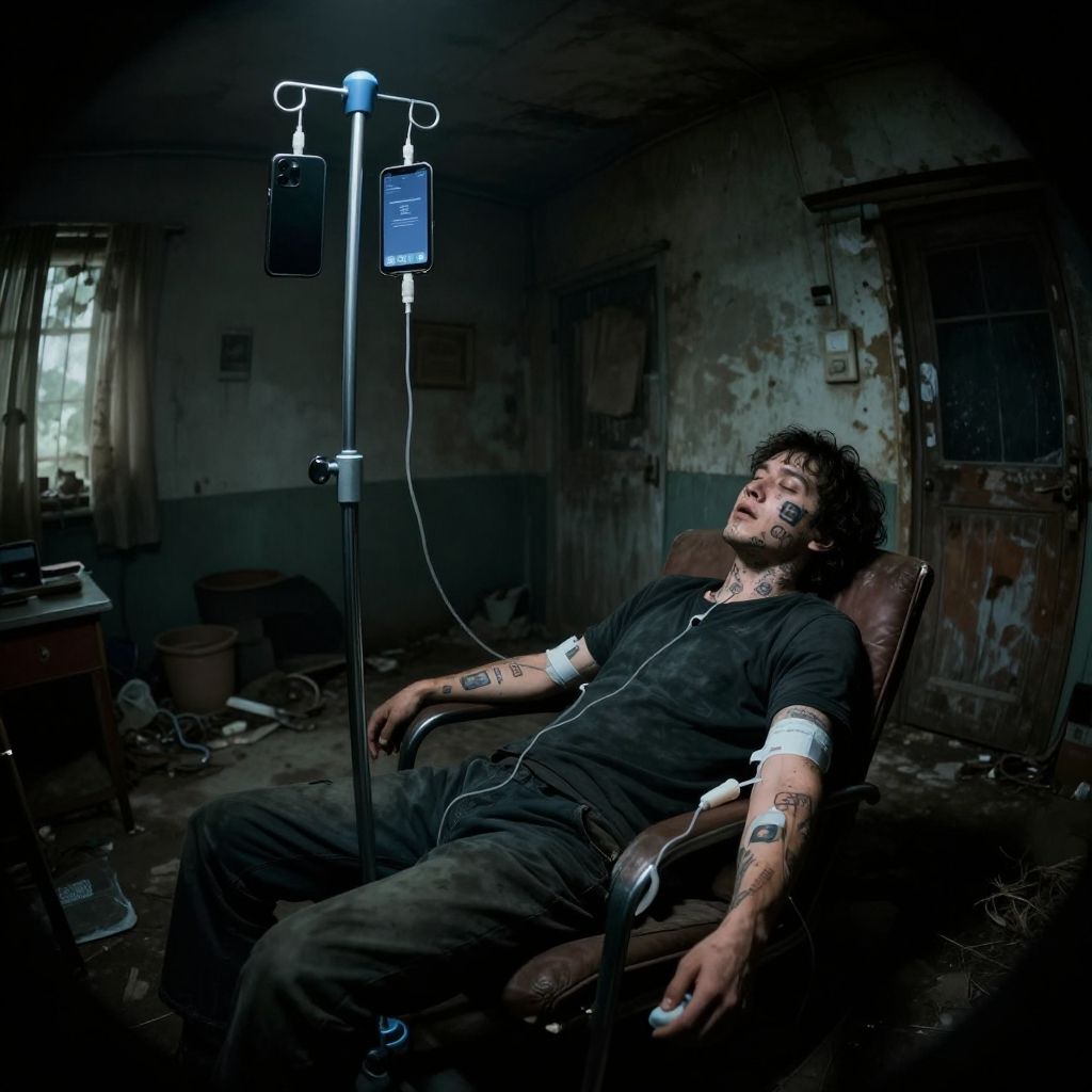 Seen from a distance of 5 meters away, a person in a filthy house with face and neck tattoos of visible social media logos (the social media logos are seen on the person's face and neck) The same person is passed out in a chair in a rundown house, they are sitting beside a hospital IV pole, the same person has hospital IV tubes running into their arms but the IV pole has smartphones hanging on it. IV tubes are running from the smart phones on the IV pole into the person's veins. The smart phones hanging on an IV pole and the IV tubes running from the phones into the person's arms are also seen. :Dystopian, bleak, quasi-surrealist, melancholy, nauseating, gritty, harsh, neo-noire futurism, (also breathtaking, detailed, expansive, photorealistic ultra high definition, highest quality, ultrarealistic), perfect composition, dramatic action, sharp focus, intricate details, highly detailed, experimental angles, experimental lighting, strong fisheye view, bokeh, disturbing cinematic morbidity, psychologically unsettling, Zeiss Master Prime Lenses, Panavision, Film Stock Footage, with a Nikon Z 14-30mm f/4 lens at 30mm. 10 seconds, f/5.6, ISO 6400, perfect Cinematic photograph, magnificent, ethereal, epic, terror inspiring, motion blur