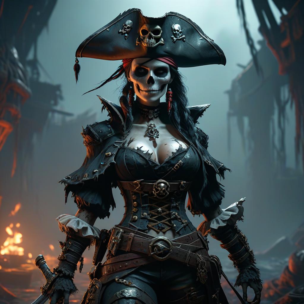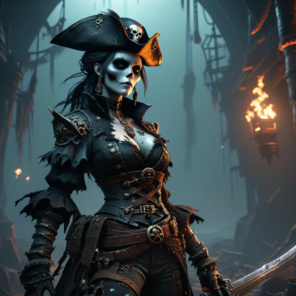 Undead pirate queen with a perfect body, full body portrait, horror core, apocalyptic, grimdark atmosphere, sharp focus, highly detailed, digital art, trending on artstation, cinematic lighting, studio quality, Unreal Engine 5 rendered, octane rendered, style of Krenz Cushart