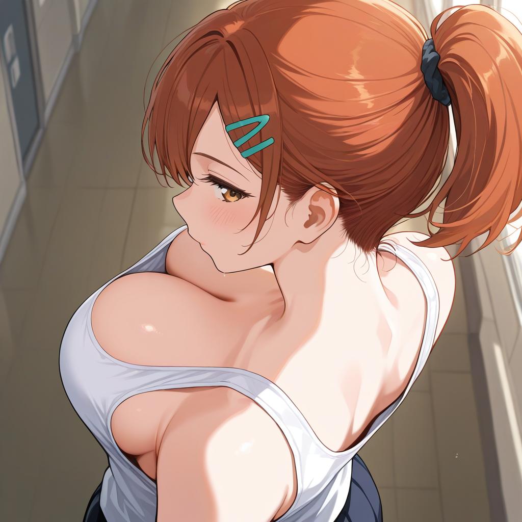 Digital illustration of an anime girl with auburn layered bob hairstyle and ponytail secured with a dark hair ornament, brown eyes, and hair clips. She is wearing a white tank top with visible cleavage, posed in a school hallway, looking back over her shoulder with a sideways glance from above.