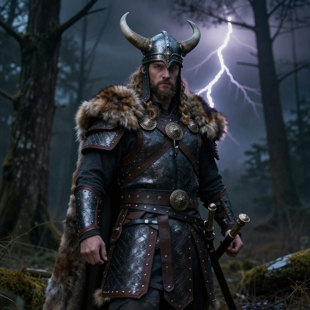 A powerful Viking warrior stands in a dark forest illuminated by dramatic lightning strikes. The warrior is dressed in ornate armor with fur accents and a horned helmet, exuding strength and mysticism against a stormy night sky.