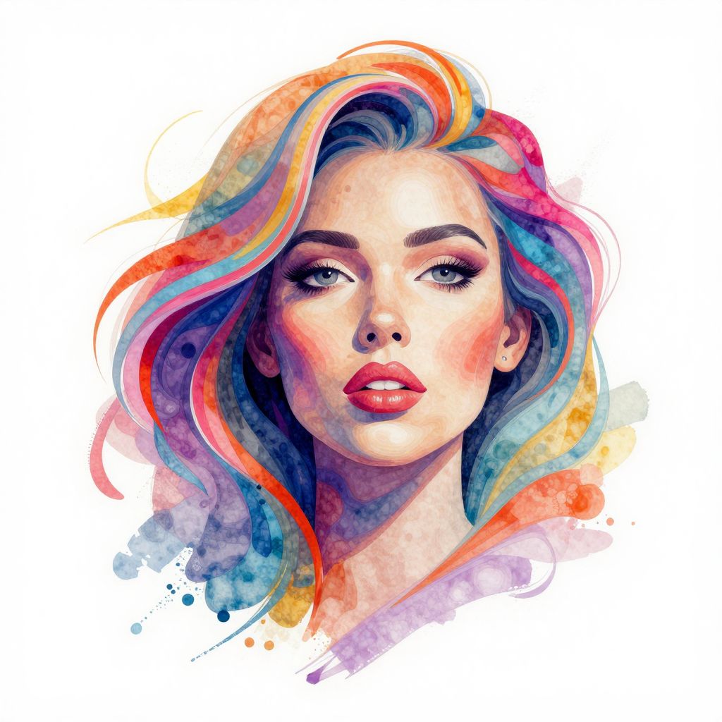 Digital watercolor portrait of a fair-skinned woman with vibrant, multicolored hair, striking green eyes, and bold red lips, set against a