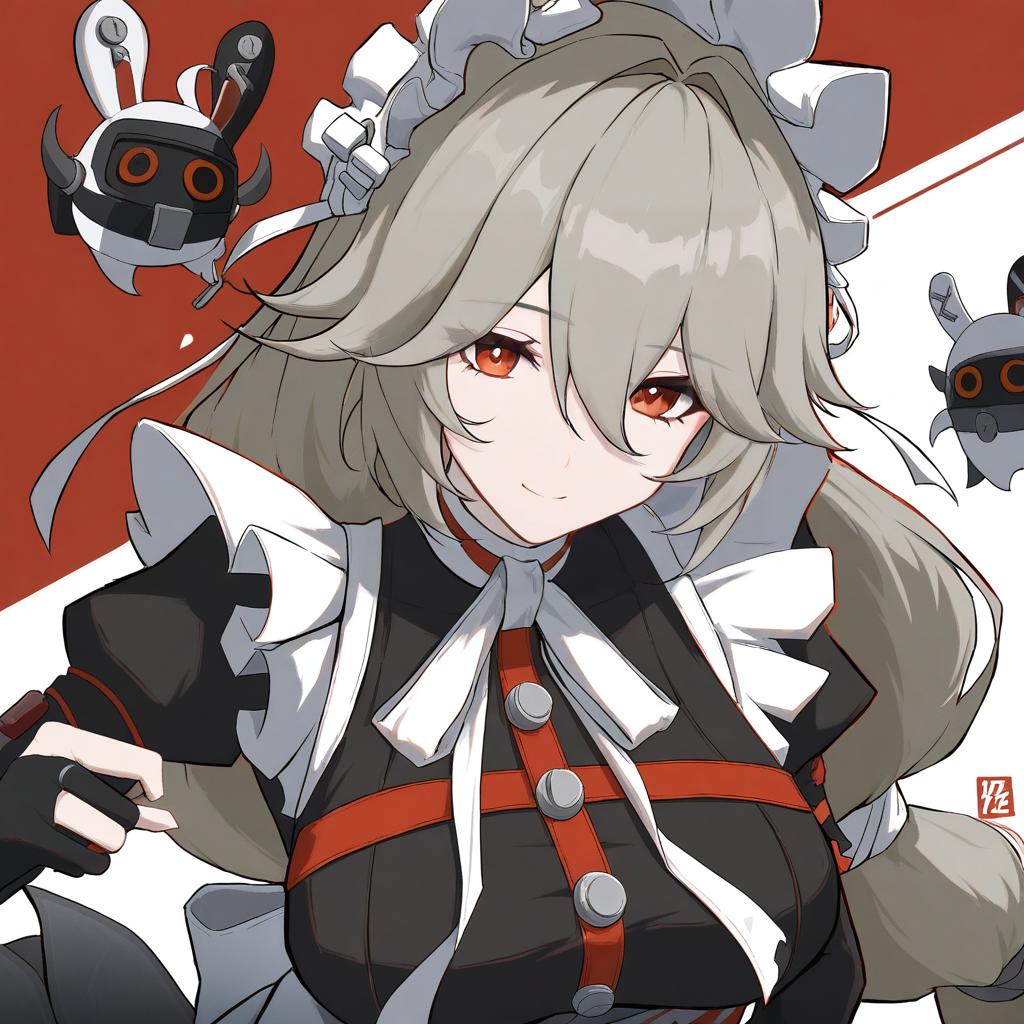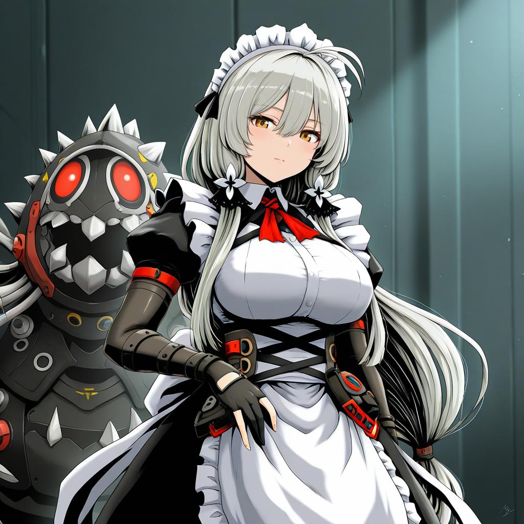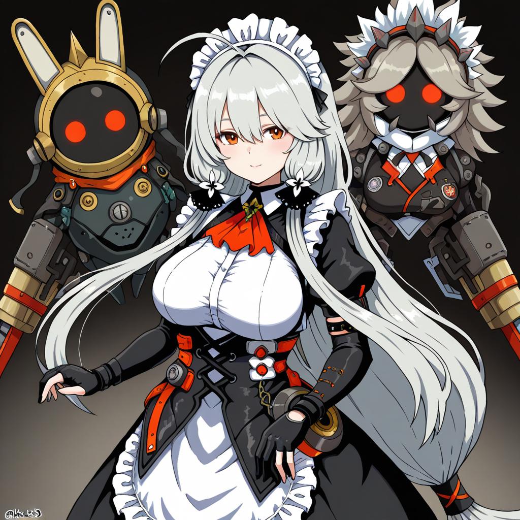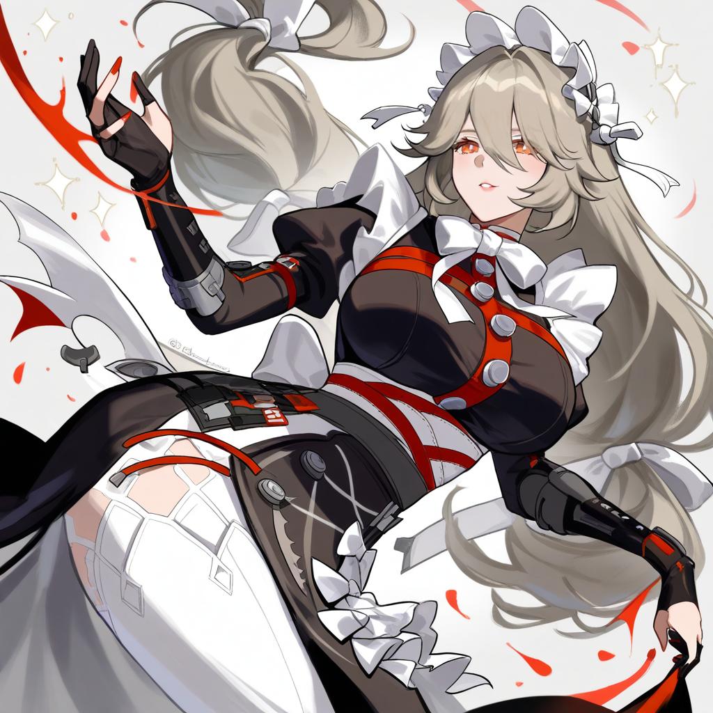 Alexandrina sebastiane, zenless zone zero, 1girl, maid, maid headdress, maid, red eyes, hair between eyes, grey hair, very long hair, long hair, low-tied long hair, large breasts, partially fingerless gloves, black gloves, black dress, by artist banned artist, leet