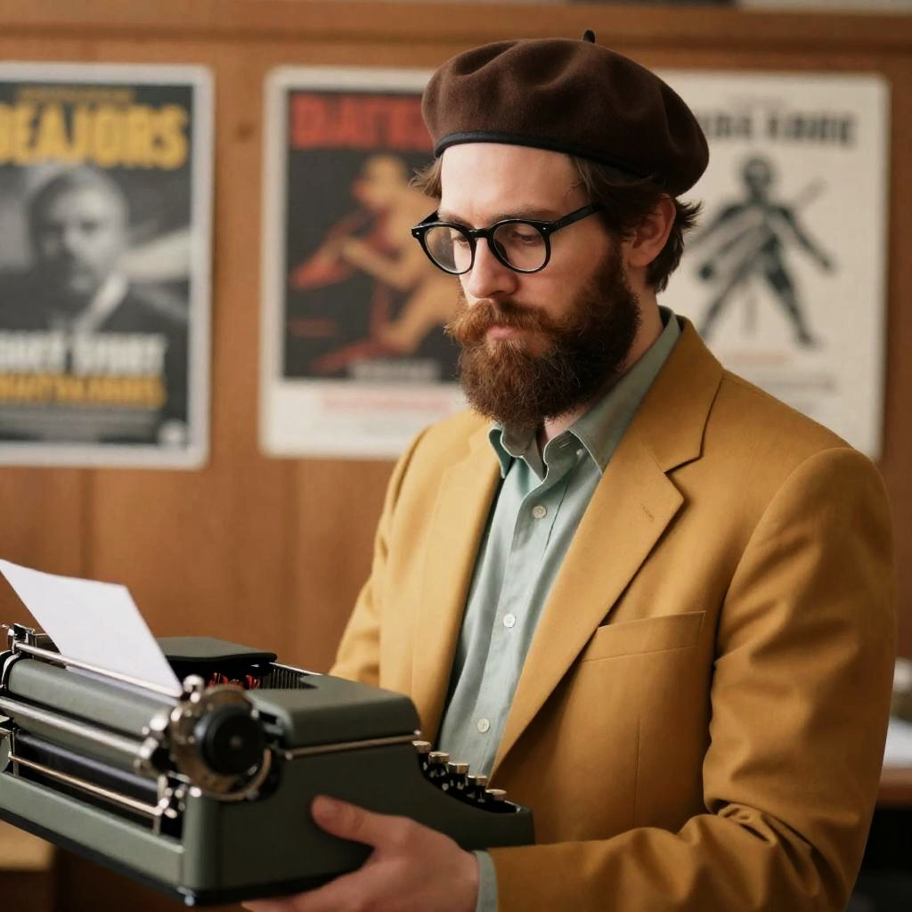 Photograph of a bearded man with brown hair, wearing glasses and a brown beret, in a mustard-colored suit over a light green shirt. He holds a large, old-fashioned typewriter. Background has a wooden wall with various posters. Man has a focused expression.
