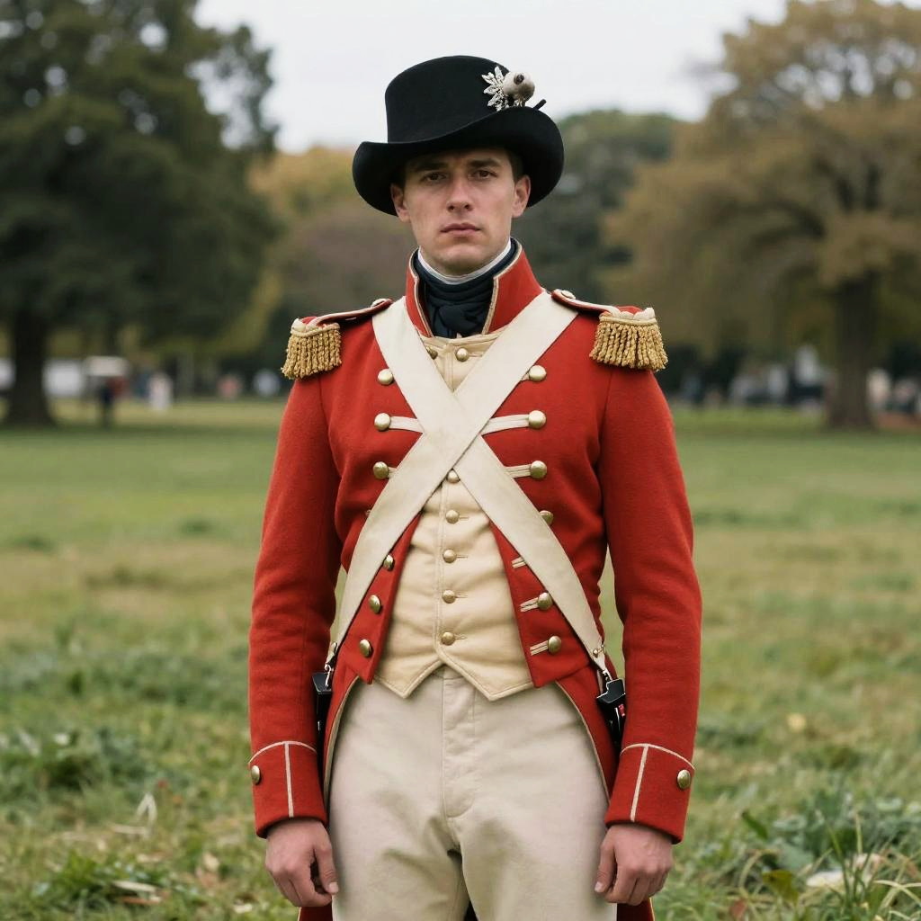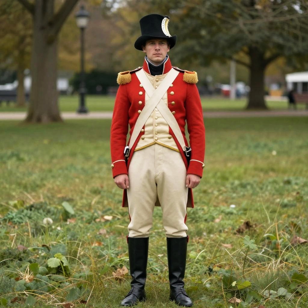 Revolutionary Soldier Costume, man in a red coat and hat standing in a park