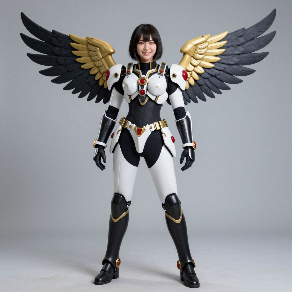 Photograph of an Asian woman with a short black bob haircut, standing confidently against a plain gray background. She is dressed in a detailed, form-fitting white and black armor suit with gold wing accents on her back, black feathered wings, and red gemstones on her chest and shoulders. Her boots are black with gold and red details. She has a cheerful expression, and her armor has a futuristic, sci-fi appearance. The lighting is even, highlighting the texture and color contrast of her outfit.