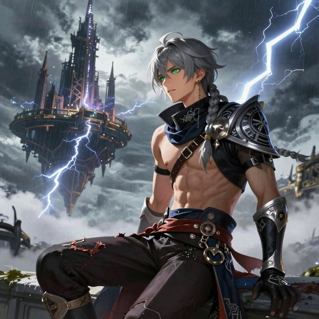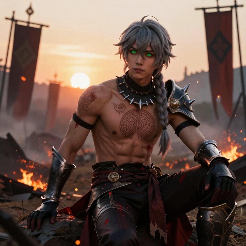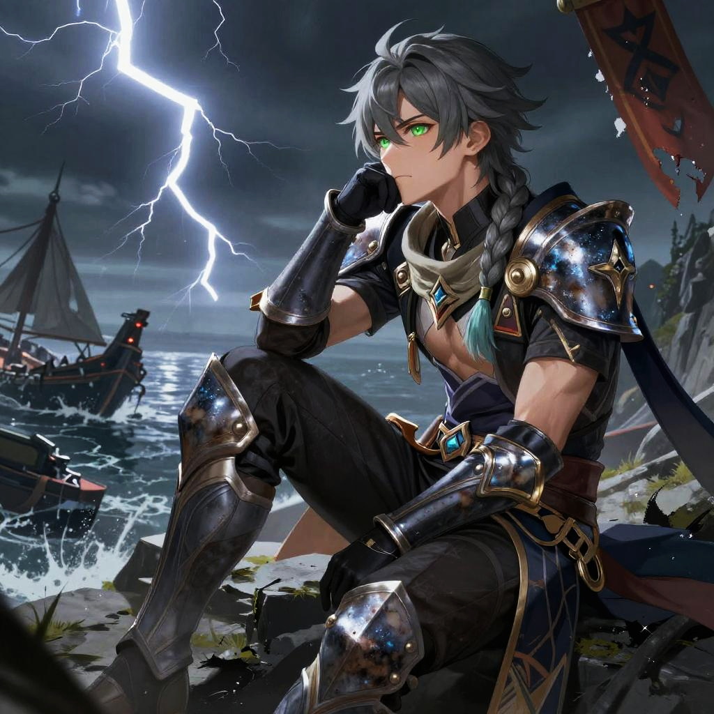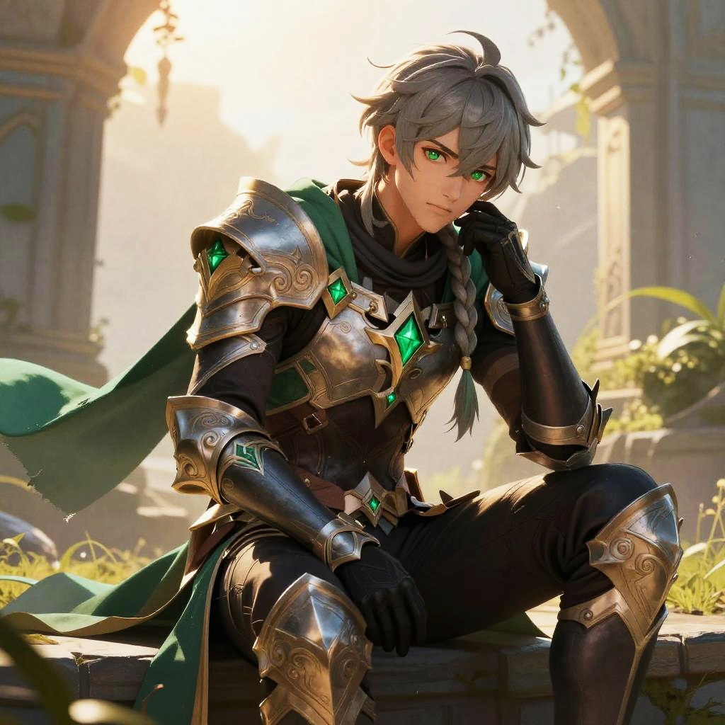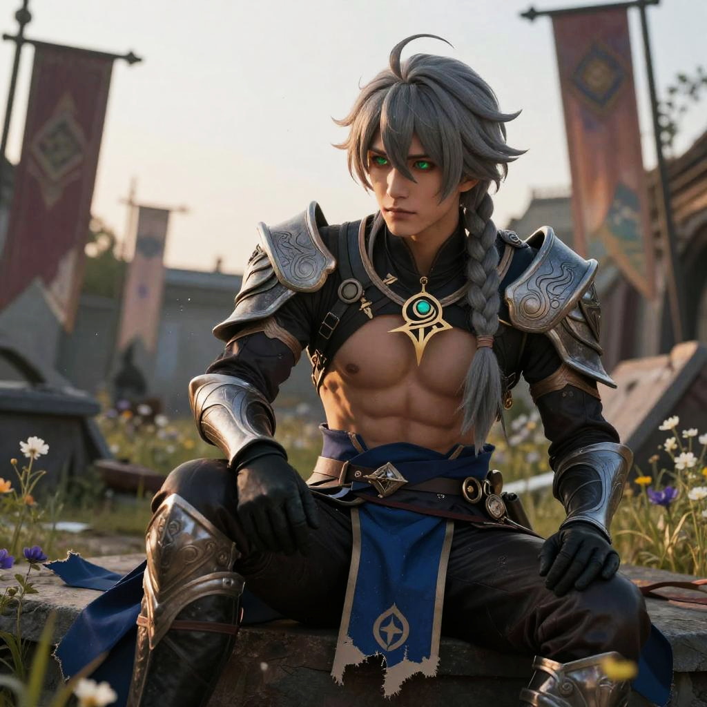 Aether genshin impact, muscular male, sitting, green eyes, grey hair, braid, armor, detached collar, gauntlets, fantasy setting, dynamic composition, intense scene, emotional expression, melancholic resolve, ruined cathedral beneath aurora-lit skies, soft celestial rim-light with drifting motes, engraved pauldrons with emerald inlay and tattered cloak hem