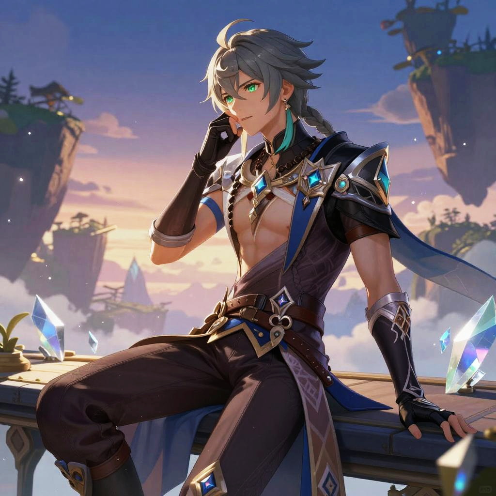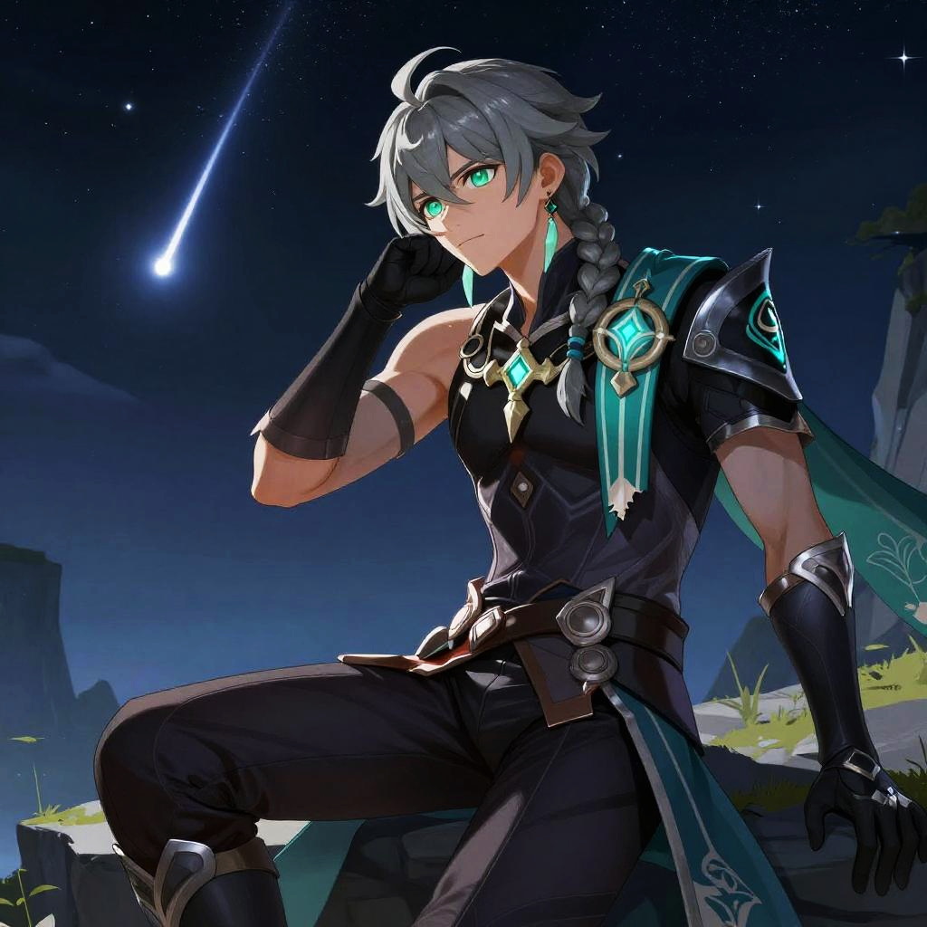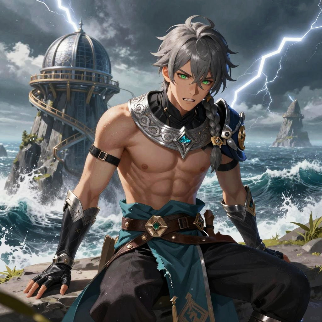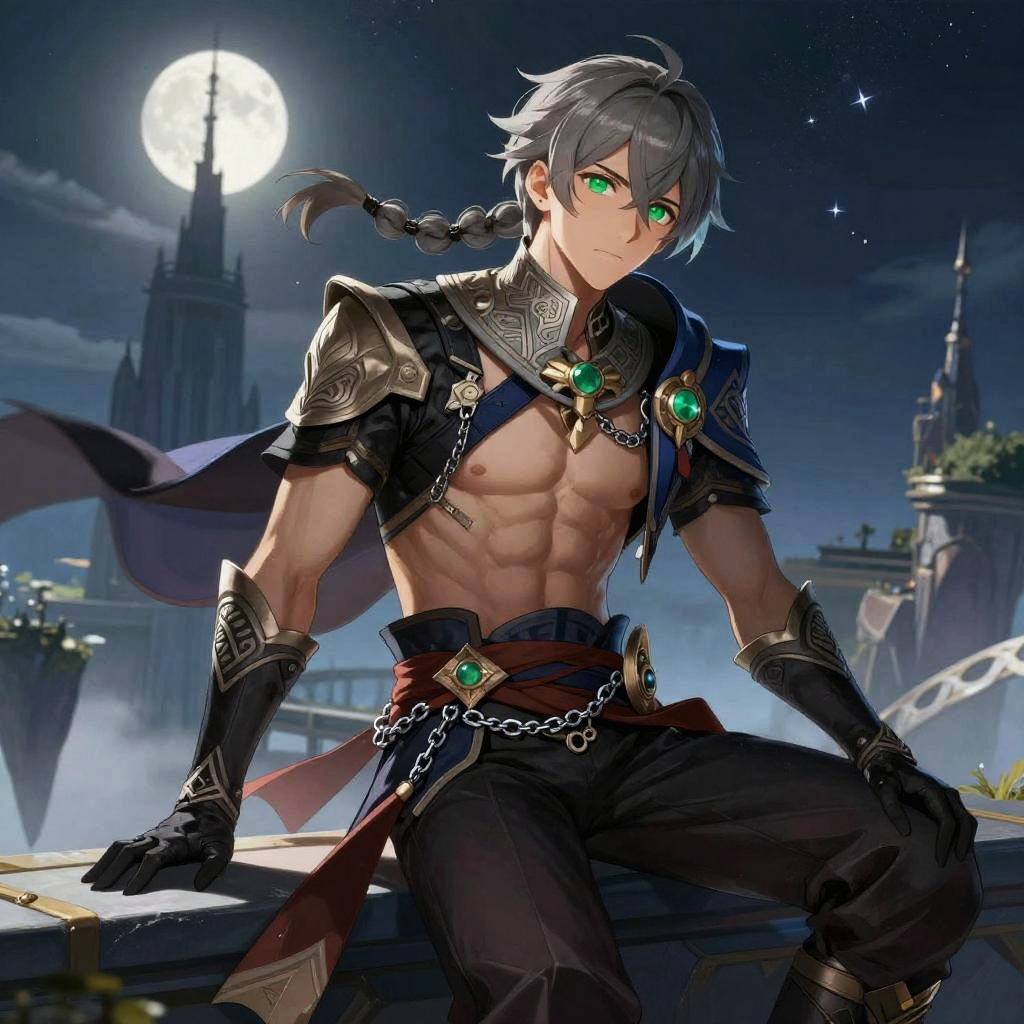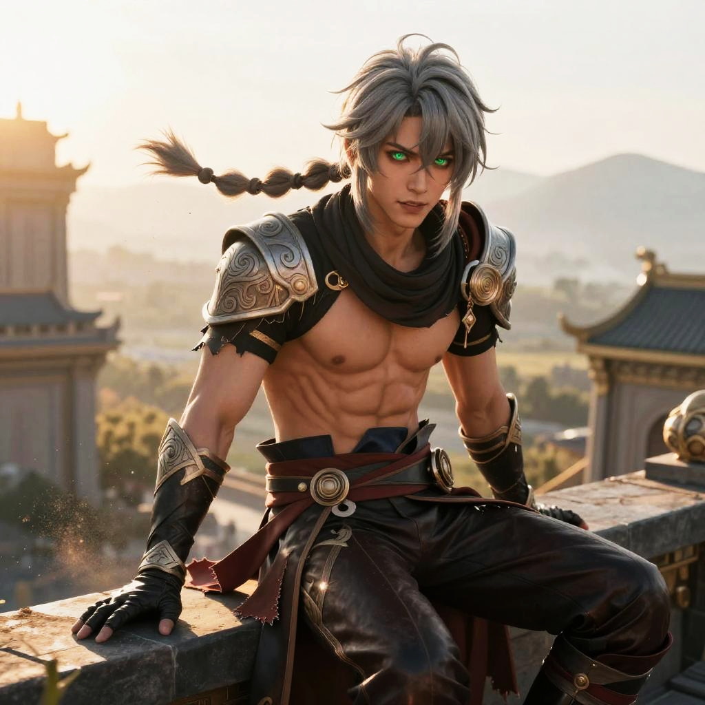 Aether genshin impact, muscular male, sitting, green eyes, grey hair, braid, armor, detached collar, gauntlets, fantasy setting, dynamic composition, intense scene, emotional expression, melancholic resolve, ruined cathedral beneath aurora-lit skies, soft celestial rim-light with drifting motes, engraved pauldrons with emerald inlay and tattered cloak hem