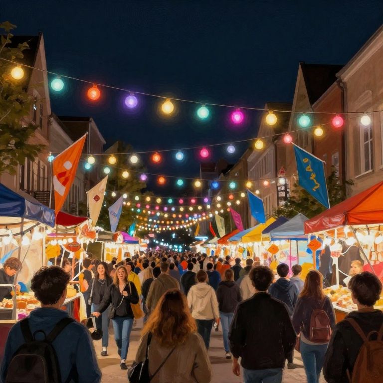Photograph of a bustling evening street market. Vibrant multi-colored string lights hang overhead, illuminating the scene. Stalls with colorful canopies on both sides sell various goods. A diverse crowd of people, dressed in casual clothing, walks and browses. Flags in bright colors adorn the stalls. Buildings with steep roofs flank the street. The sky is dark blue, indicating dusk. The market's lively atmosphere is enhanced by the warm, colorful lights and the crowd's animated movement.