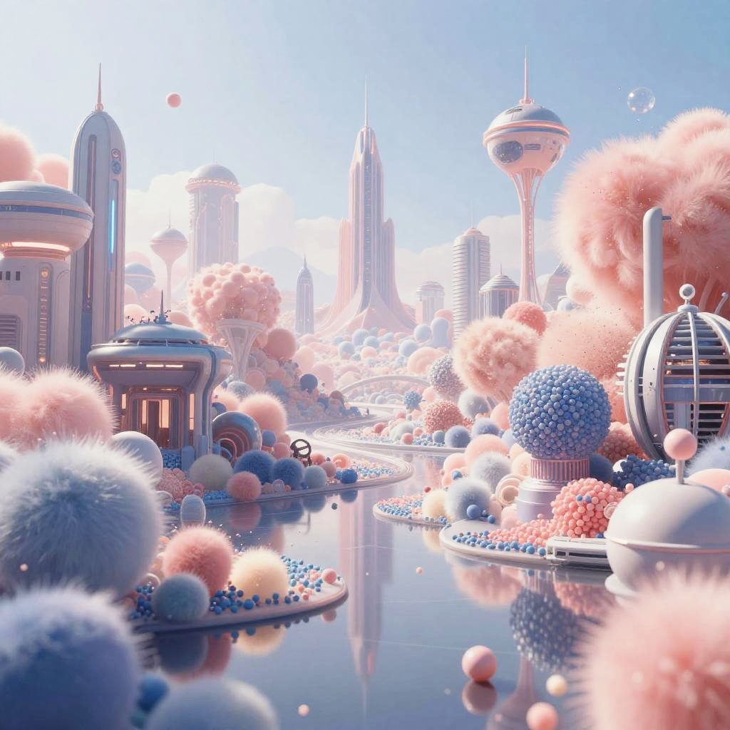 Stable diffusion reimagine shown as a dreamlike scene where flowing particles transform into futuristic structures, soft lighting, pastel hues, immersive sci-fi environment