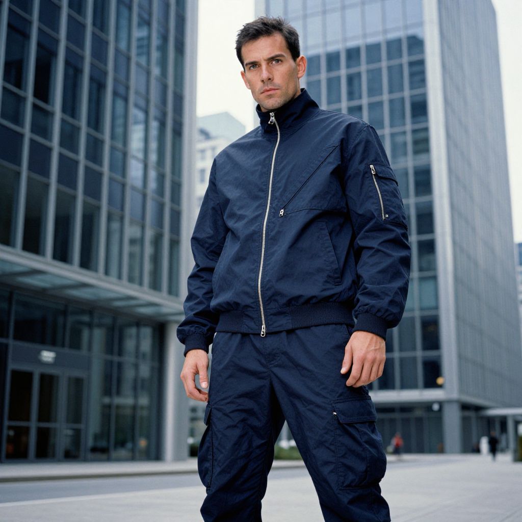 A man, asymmetrical zip-up jacket, cargo joggers, deep navy blue, urban stealth aesthetic, modern glass buildings, Cibachrome style, confident expression, poised stance.Man has masculine face and piercing eyes