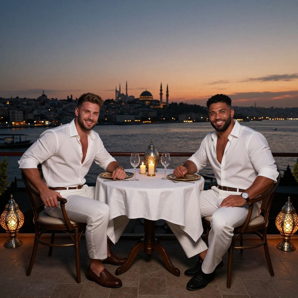 A male couple (a dark blond German and a black-haired Turkish), evening, sunset, sitting opposite each other at a set table on the terrace on the upper floor in Istanbul, view of the Bosphorus, orientalic candles on the table, oriental lamps on the terrace, they are wearing fine cloth trousers, half-open white shirt, smiling lucky at the camera, very muscular, hairy, male, stars in the sky, realistic, 8K, (realistic eyes), realistic hands, high quality: 1.4, cinematic, bulge