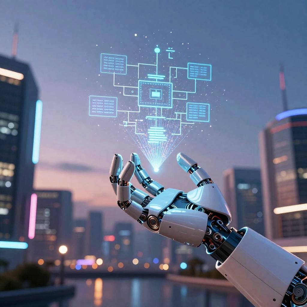 Stable diffusion AI, a sleek robot hand releasing a stream of data particles into the air that transform into complex algorithms, set against a futuristic cityscape at twilight, blending realism and sci-fi with bright neon accents and reflective surfaces.