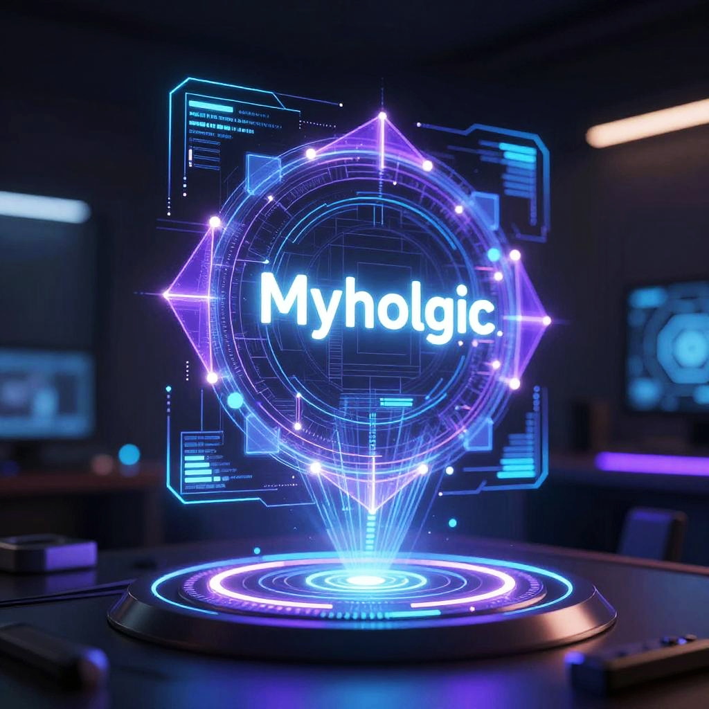 Myhologic advanced AI interface hologram in a dark room, glowing geometric shapes and data streams swirling around, cyberpunk vibes with purple and blue neon colors, highly detailed digital art, focus on technology and futuristic innovation.