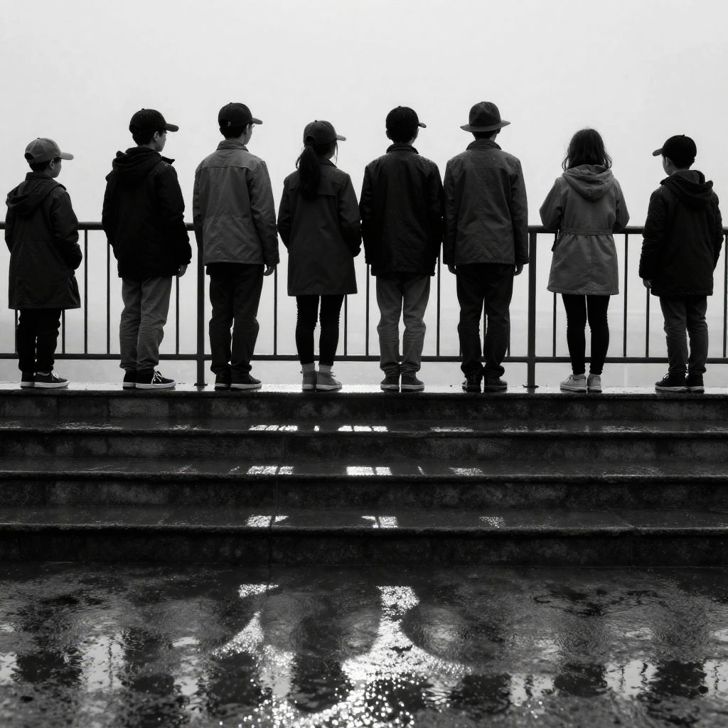 Monochrome, greyscale, multiple boys, silhouette, hat, 6+boys, railing, stairs, shadow, standing, 4boys, rain, 1girl, 5boys, coat, multiple others
