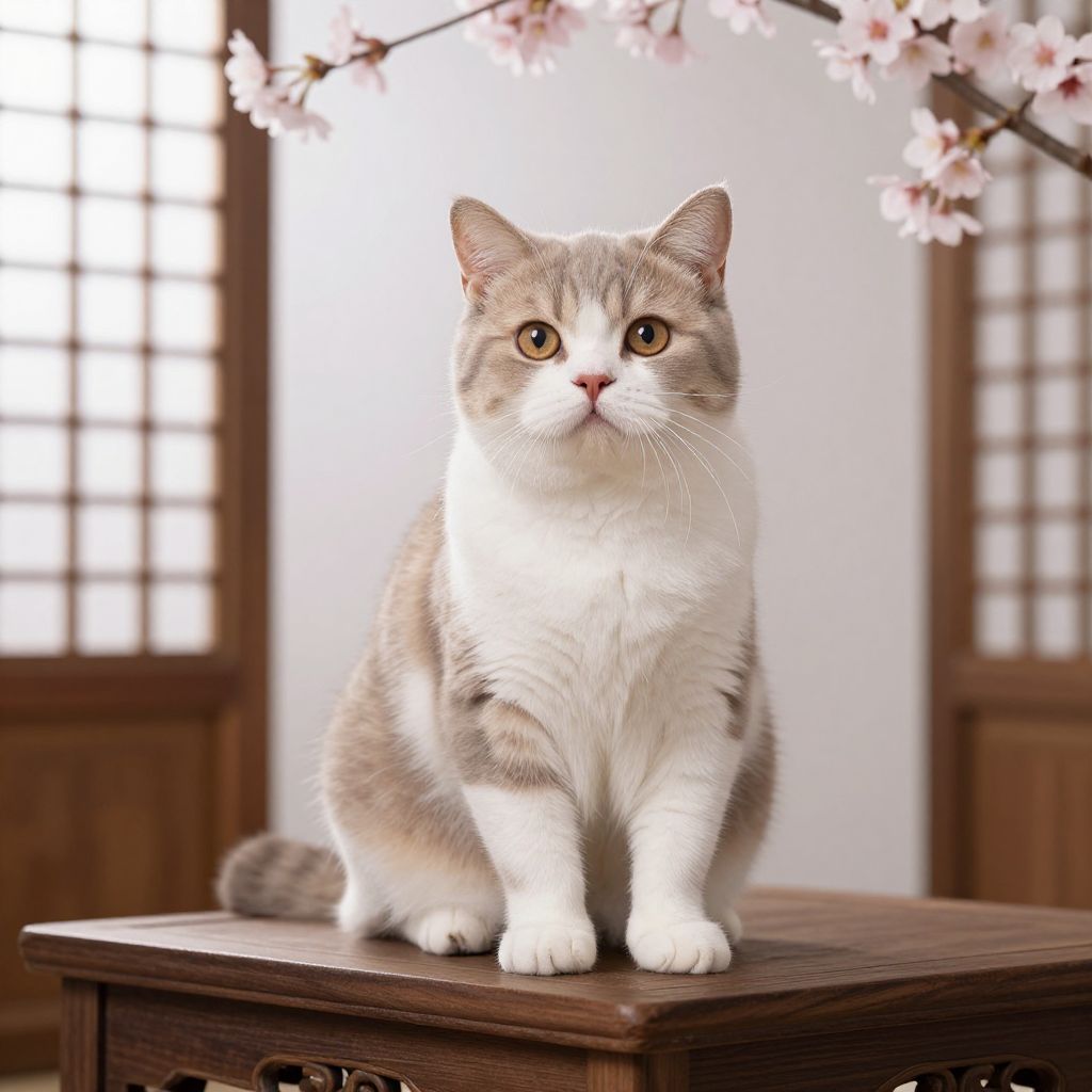 Chinese short hair cat sitting gracefully on a traditional wooden table, surrounded by delicate cherry blossoms and soft natural light filtering through a paper window, capturing the serene beauty and elegance of this feline breed.