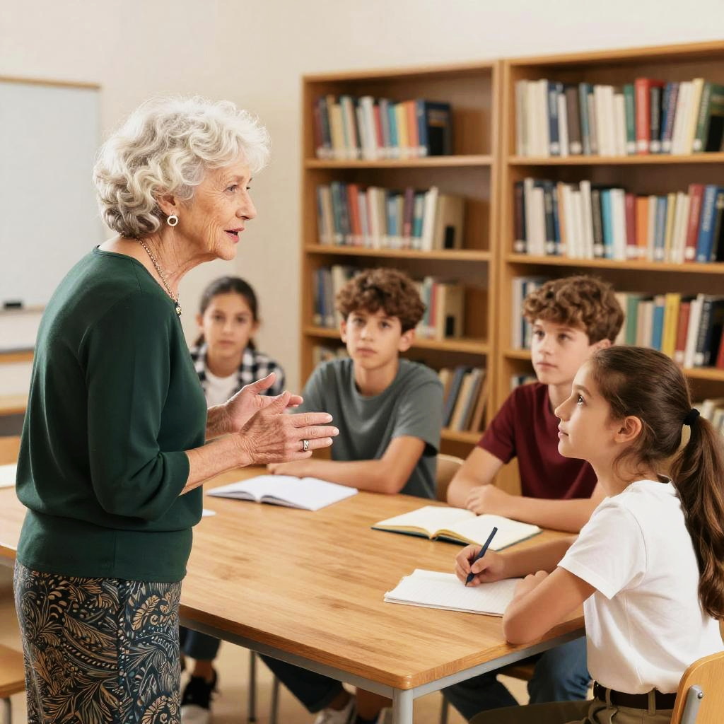 A vibrant photograph of a lively classroom scene. A blonde woman with curly hair, wearing a colorful plaid shirt and white pants, stands at the center, gesturing animatedly. She's surrounded by six diverse students, four men and two women, dressed in casual attire, seated at a wooden table. The background features tall bookshelves filled with books, adding a scholarly vibe. The lighting is bright, highlighting the engaged discussion.