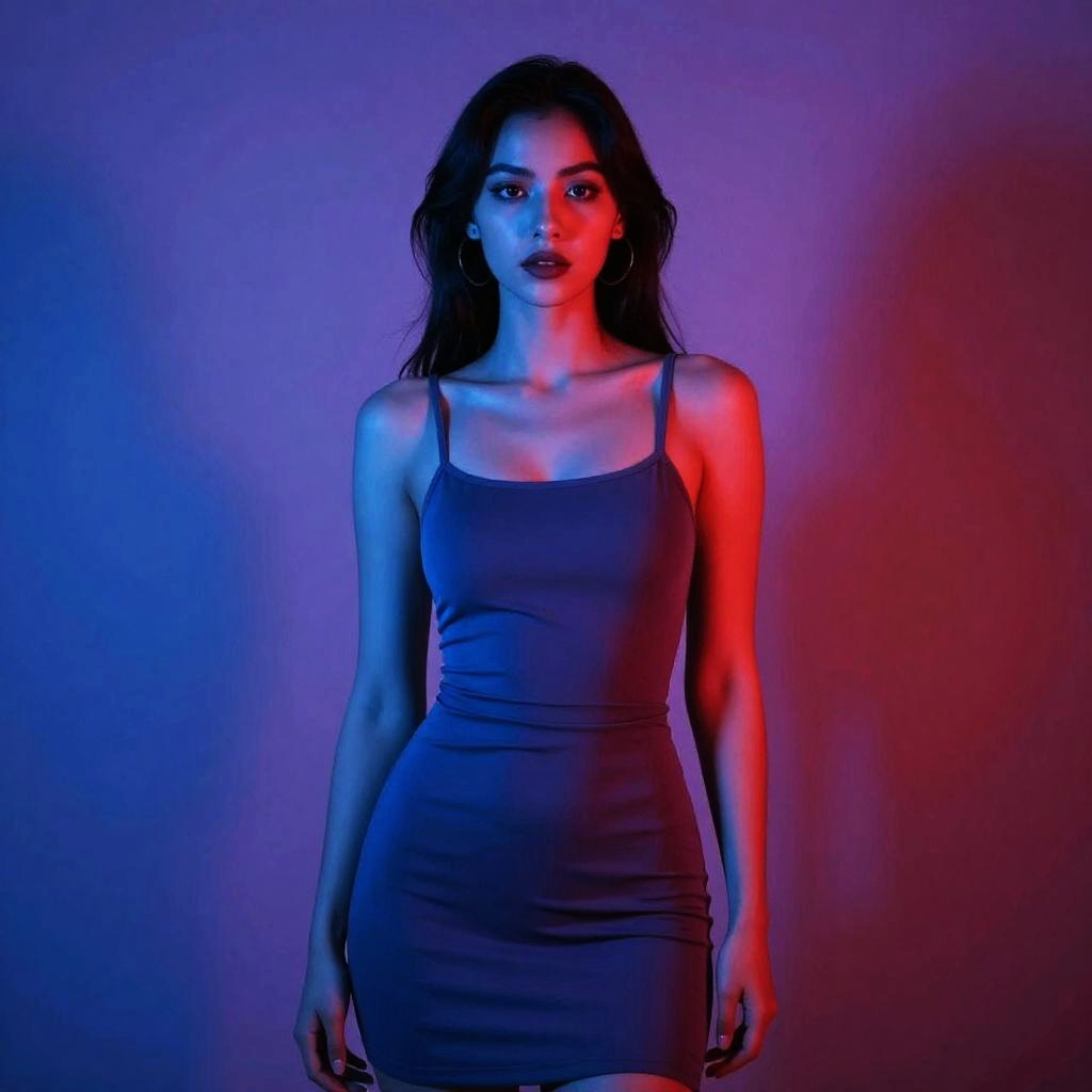 A striking portrait of a woman standing confidently against a vibrant neon-lit background, blending blue and red hues for a dramatic effect. The image features stylish, high-contrast lighting that emphasizes her elegant pose and form-fitting dress, capturing a modern and cinematic mood.