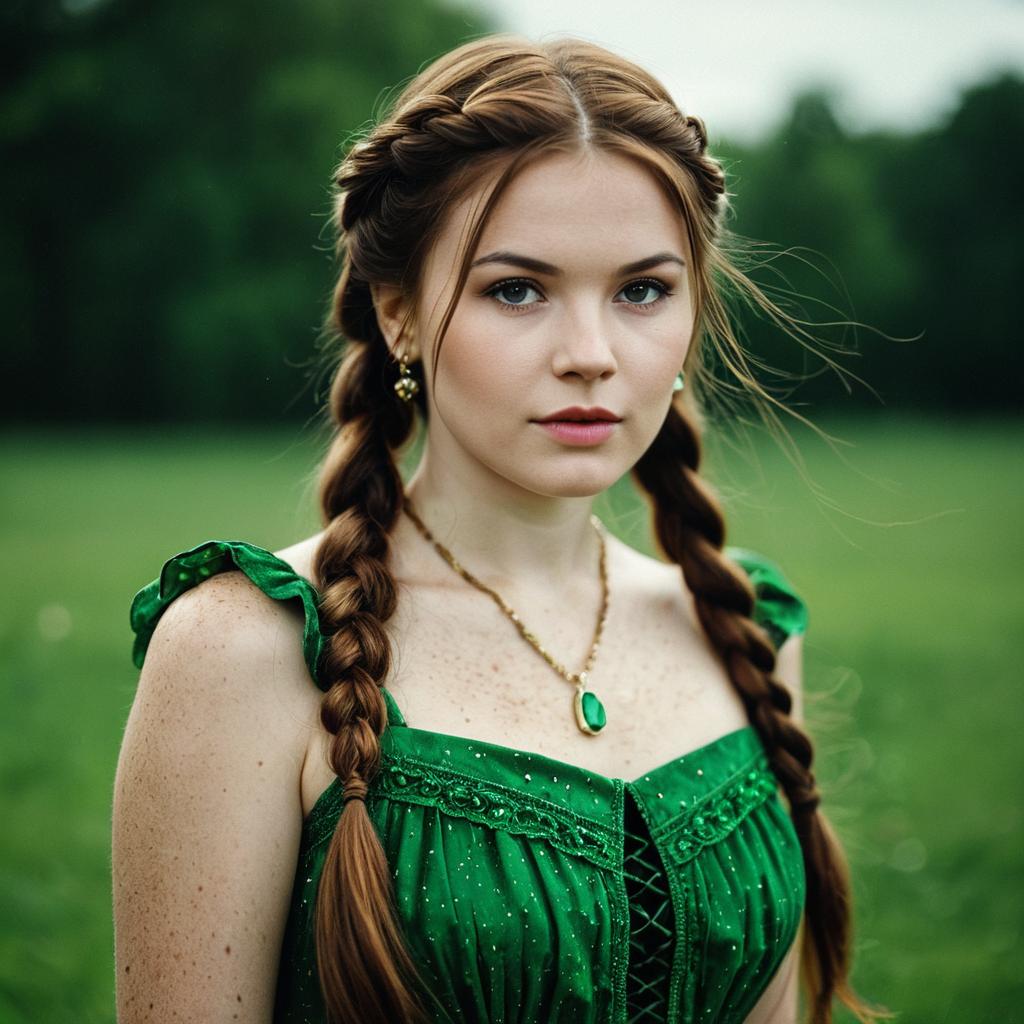 Costume green dress,1girl, solo, dress, green dress, braid, brown hair, green eyes, long hair, looking at viewer, jewelry, blurry background, outdoors, blurry, freckles, realistic