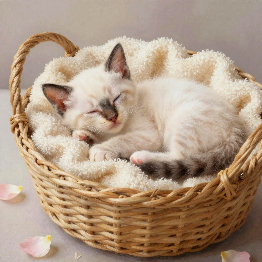 Sleepy baby kitten blue eyes curled up inside a woven basket with soft blankets, surrounded by gentle pastel tones and flower petals, cozy and tender ambiance, hyper-realistic digital painting with intricate details