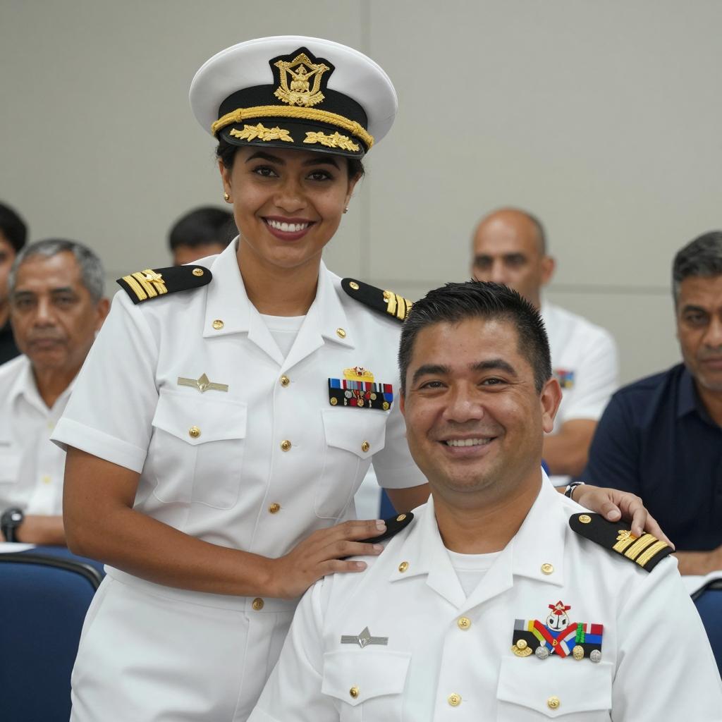 A man and woman in a close embrace at a crowded party. The man, in a white military uniform with a gold star on the shoulder, holds the woman's chin gently. The woman has dark curly hair, wears a thin-strapped brown top, and looks intently at the man. Background includes blurred partygoers in white shirts. The man's face is in profile, showing a focused expression, while the woman's face is in profile, showing concentration. Multiple people are in the background.