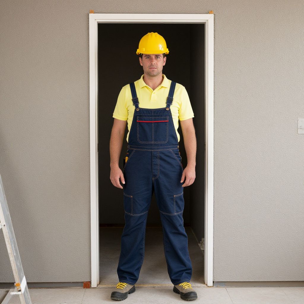 Photograph of a male construction worker standing in a doorway, wearing yellow helmet, yellow shirt, black overalls, and yellow shoes.