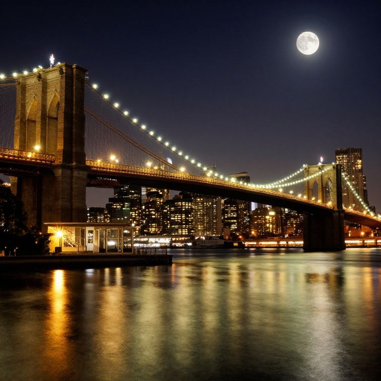 The image depicts a stunning night scene featuring the iconic Brooklyn Bridge, bathed in a warm, golden glow. The bridge, a marvel of engineering, spans the East River, its towering arches and intricate cable network illuminated by strings of lights that cascade down its length. The water below reflects the bridge's lights, creating a mesmerizing, silky surface that mirrors the bridge's structure and the city skyline beyond. The cityscape, a silhouette of towering skyscrapers, is dotted with countless lights, adding to the urban glow. The sky above is a deep, starry expanse, with a full moon casting a serene light over the scene. The overall composition is a harmonious blend of natural and man-made elements, with the bridge and city lights creating a dynamic interplay of shapes and colors. The image is rendered in a photorealistic style, with meticulous attention to detail, capturing the essence of the Brooklyn Bridge at night with a cinematic flair.