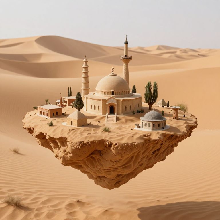 Digital artwork: A floating desert island with a white-domed mosque, minaret, and various buildings surrounded by endless sand dunes.
