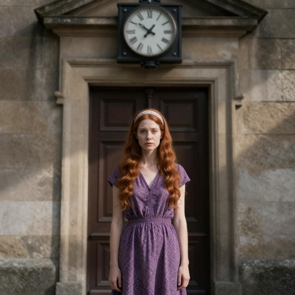 Woman with red hair, wearing a white lace shawl and long white dress, standing on train tracks. Overcast background, railway station with trains and overhead wires. Foggy atmosphere, empty platforms, multiple tracks converging. Neutral facial expression.