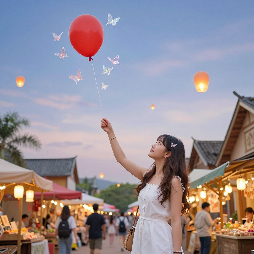 Photograph of an Asian woman with long, wavy dark hair and a white sleeveless dress, standing in a bustling evening market. She gazes upward at a red balloon with white butterfly decals floating away. The sky is a gradient of blue to pink, and lanterns hang above. Market stalls with colorful lights and people in the background create a lively atmosphere. She has a small white butterfly hair clip. The scene is illuminated by soft, warm market lights, enhancing the festive, serene mood.