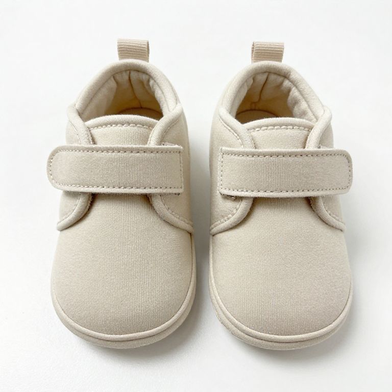 Photograph of beige baby shoes with elastic straps, textured fabric, and soft interior, positioned side by side on white background.