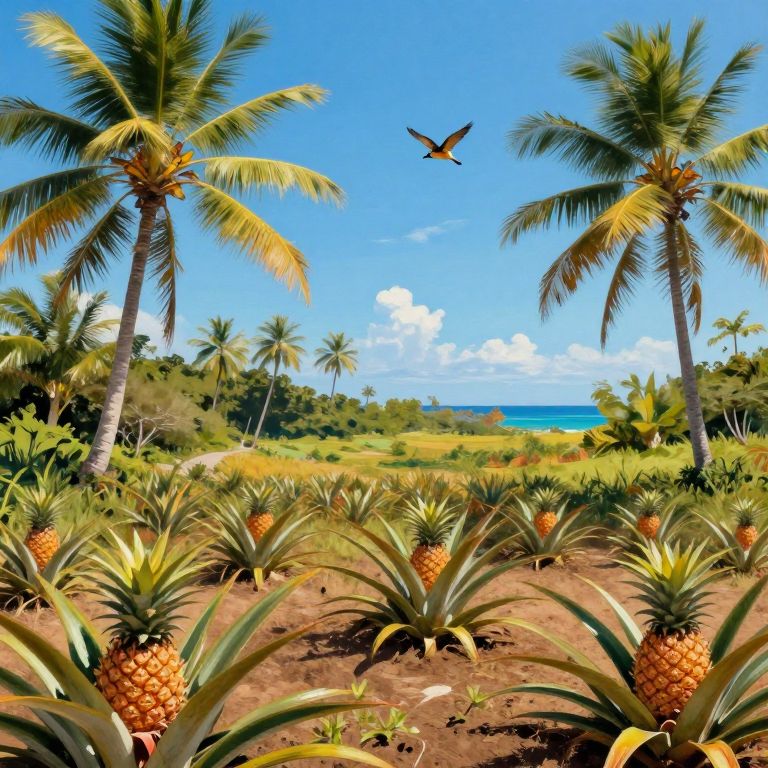 Pina, tropical paradise with pineapple plants growing in fertile soil under clear blue sky, exotic birds flying, immersive scenic landscape, vibrant colors with painterly style, warm and inviting tropical atmosphere