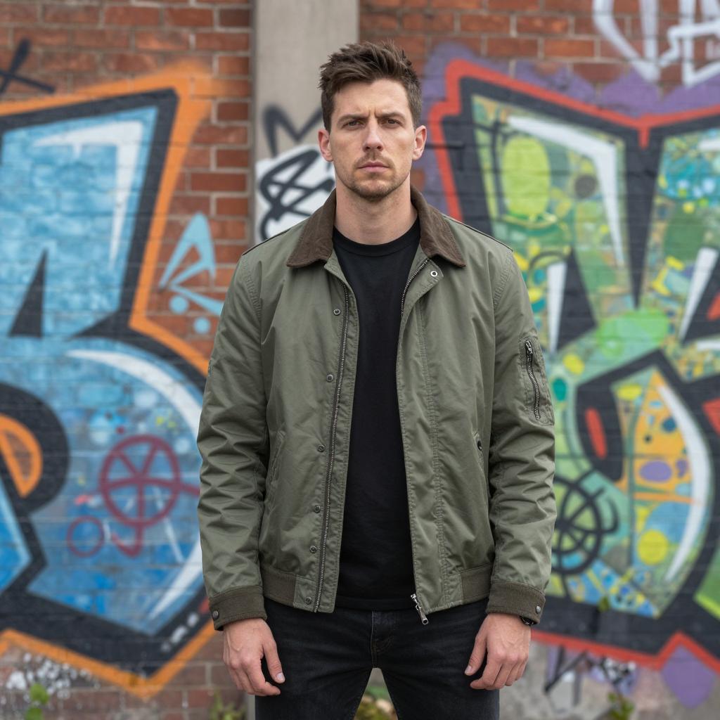 A man in a green jacket poses confidently in front of a vibrant graffiti-covered brick wall, blending urban style with artistic expression.