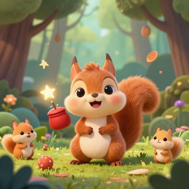 Illustration of a cute, happy squirrel with a fluffy tail standing on grass in a magical forest. The squirrel holds a red jar emitting glowing star-shaped sparkles. Two smaller squirrels companion the main character surrounded by colorful flowers and floating cookies in a whimsical, vibrant forest setting.