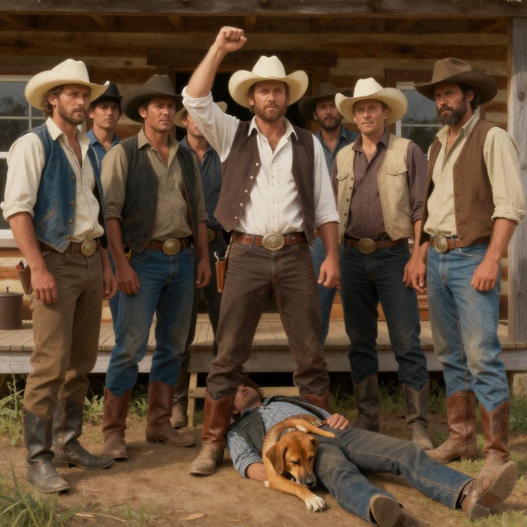 Western-style painting of 8 men in front of a log cabin. Men wear cowboy hats, vests, and boots. Central figure stands with fist raised, others gather around. One man lies on ground, unconscious. Brown dog lies near him. Warm, earthy colors. Intense expressions on men's faces. Log cabin in background, window visible. Group interaction, varied postures.
