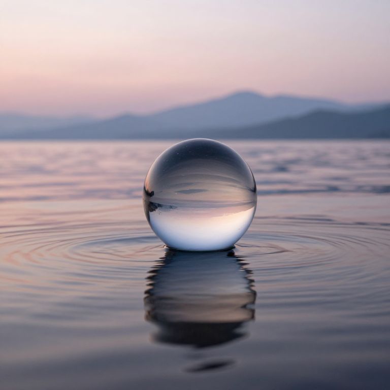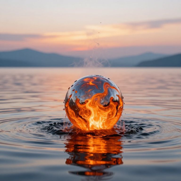 An infinite, calm water surface stretches across the scene, reflecting the soft pastel hues of a serene sunset, Just emerging from the water, a molten metal sphere rises, its surface glowing with fiery orange and molten silver streaks that ripple like liquid energy, The sphere glistens as water cascades off its surface, forming droplets that sizzle into steam upon contact with the molten metal, Surrounding the sphere, concentric ripples disturb the stillness of the water, catching reflections of the glowing orb and the fiery hues of the sky above, The distant horizon fades into a misty gradient of soft blues and golds, with faint silhouettes of mountains adding depth and mystery, The molten sphere radiates a faint, otherworldly glow, illuminating the surrounding water with a warm, dynamic light, The interplay between the molten metal, cascading water, and ethereal surroundings creates a harmonious yet dramatic scene, blending the elemental forces of fire and water in a visually captivating balance