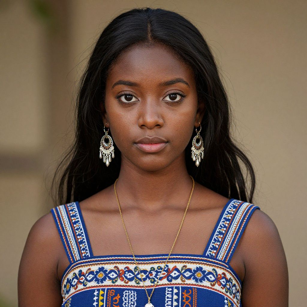 Photograph of a smiling Black woman with straight black hair, wearing a vibrant blue dress with a silver belt, standing in a softly lit, blurred indoor