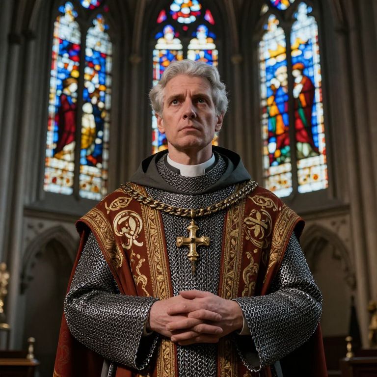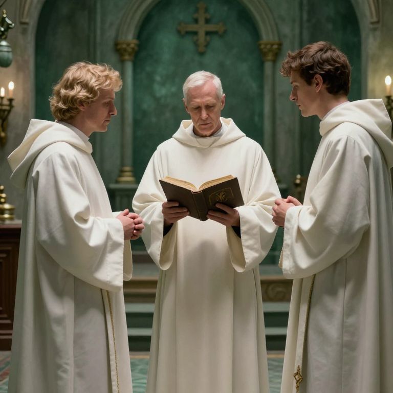 In a medieval fantasy setting, three priests dressed in white robes stand in a dimly lit, intricately decorated room. The green hues dominate the scene, casting a serene yet solemn atmosphere. The room is adorned with large, ornate columns and a series of arched windows that allow a soft, diffused light to filter in, creating a contrast between the dark interior and the illuminated figures. One priest, positioned to the right, holds a book open, possibly reading or praying. Another priest, standing to the left, appears to be engaged in conversation with the third, who faces away from the viewer. In the background, a statue of a saint or holy figure stands tall, adding to the religious ambiance of the space. The overall composition is balanced, with the figures and architectural elements carefully arranged to create a harmonious and reverent environment.