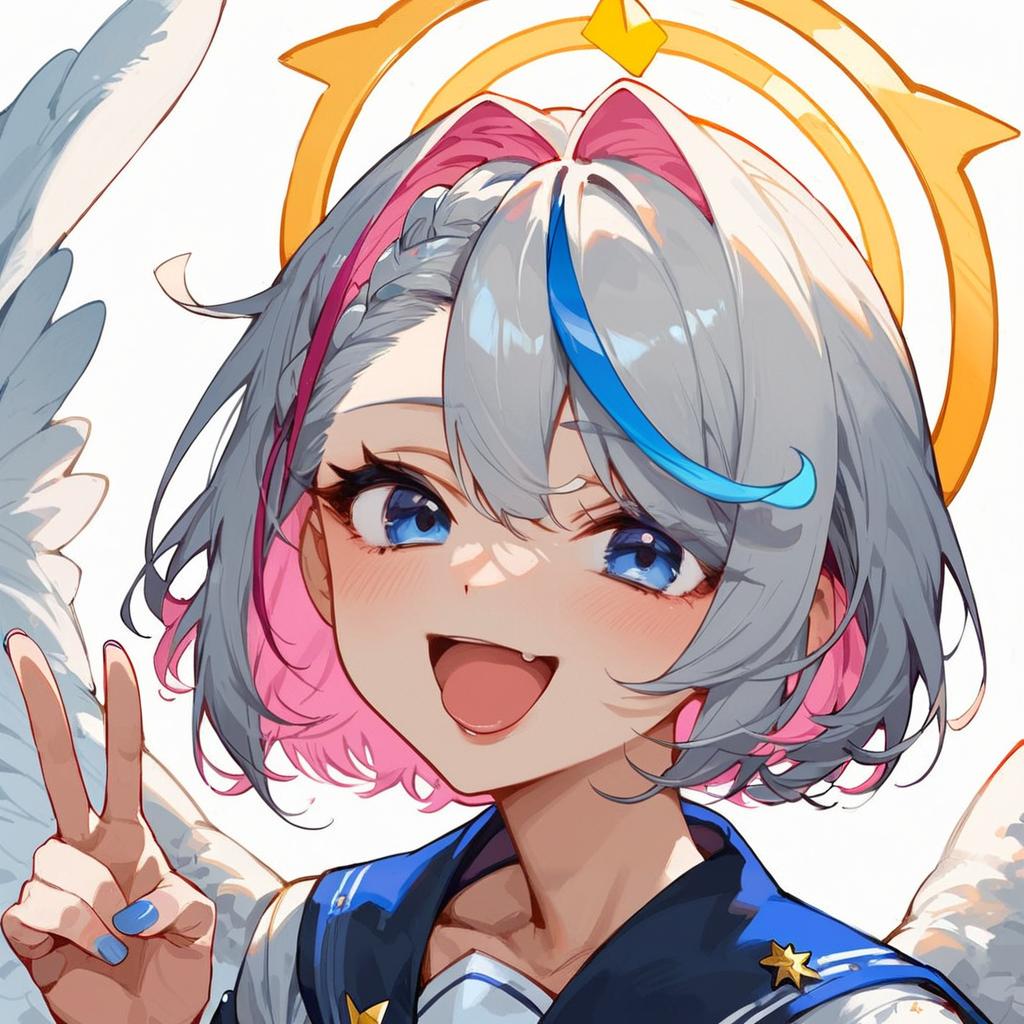 Score_9, score_8_up, score_7_up, score_6_up, score_5_up, score_4_up, masterpiece, best quality, amane kanata, solo, virtual youtuber, star halo, halo, colored inner hair, wings, angel wings, v, angel, multicolored hair, feathered wings, short hair, smile, open mouth, white background, grey hair, fang, blue hair, looking at viewer, simple background, blue eyes, skin fang, portrait, purple eyes, bob cut, nail polish, white wings, blue nails, single hair intake, from side, sailor collar, bangs, :d, streaked hair, asymmetrical hair, pink hair