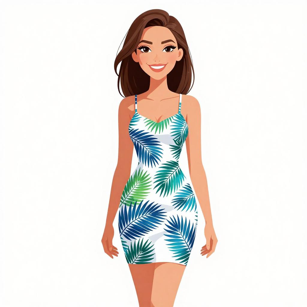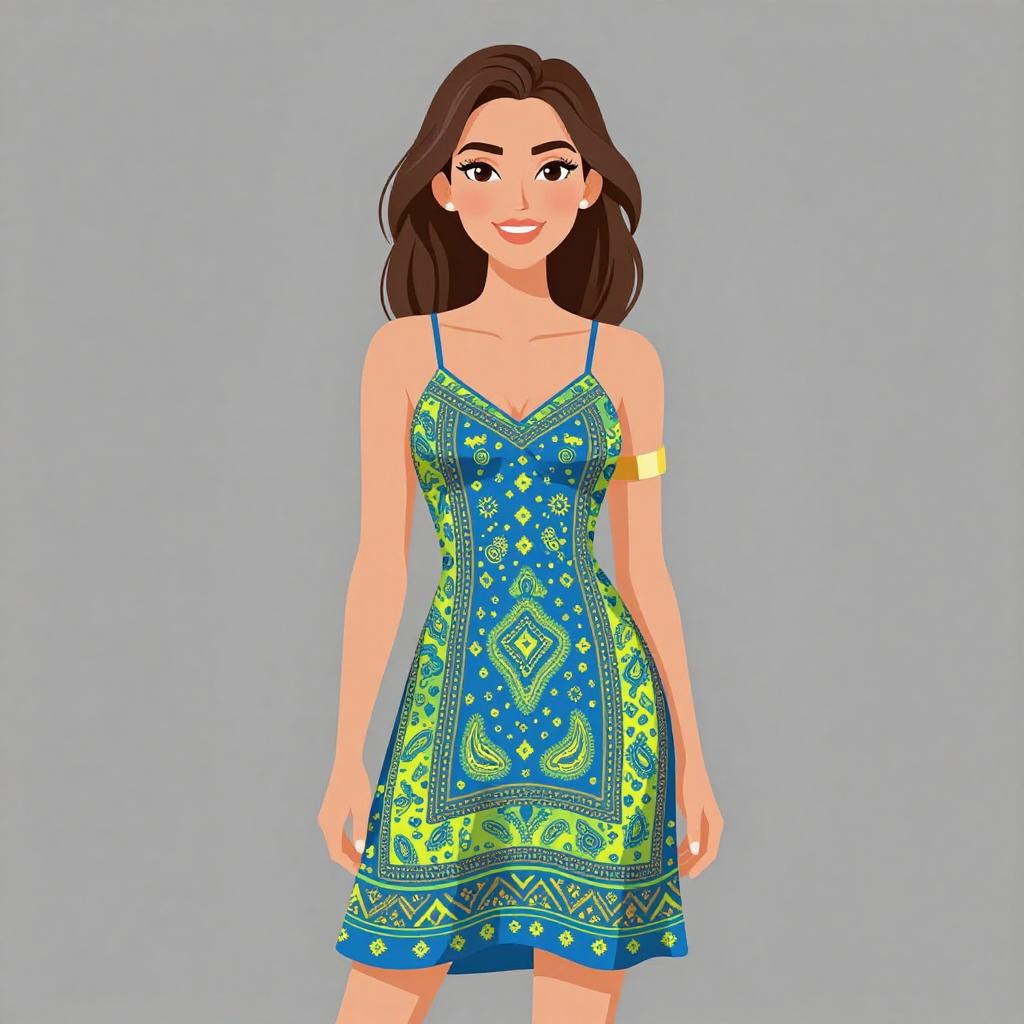 Woman with pretty face and pretty hair. smiling Woman, Bohemian, sleeveless shift dress with a mixture of vibrant blue, green, and yellow paisley and geometric prints, thin spaghetti straps, straight neckline, thigh-length with contrasting print border at the hem, gold upper arm cuff bracelet. --sref 1467